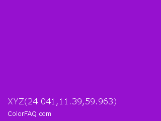 XYZ 24.041,11.39,59.963 Color is a normal purple color and the nearest color is Dark Violet #9400d3. Hex code #9611cf and RGB value is rgb(150,17,207). In RGB color space, this color is composed of 59% red, 7% green, 81% blue, In CMYK color space, this color is composed of 28% cyan, 92% magenta, 0% yellow , 19% black , In HSL color space, this color has a hue angle of 282° , 85% saturation and 44% lightness.