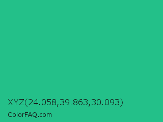 XYZ 24.058,39.863,30.093 Color is a normal green color and the nearest color is Mountain Meadow #30ba8f. Hex code #23c089 and RGB value is rgb(35,192,137). In RGB color space, this color is composed of 14% red, 75% green, 54% blue, In CMYK color space, this color is composed of 82% cyan, 0% magenta, 29% yellow , 25% black , In HSL color space, this color has a hue angle of 159° , 69% saturation and 45% lightness.