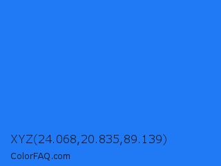 XYZ 24.068,20.835,89.139 Color is a normal blue color and the nearest color is Blue Crayola #1f75fe. Hex code #217af5 and RGB value is rgb(33,122,245). In RGB color space, this color is composed of 13% red, 48% green, 96% blue, In CMYK color space, this color is composed of 87% cyan, 50% magenta, 0% yellow , 4% black , In HSL color space, this color has a hue angle of 215° , 91% saturation and 55% lightness.