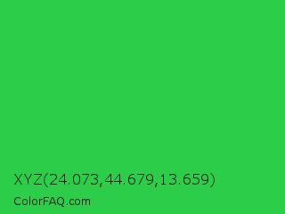 XYZ 24.073,44.679,13.659 Color is a normal green color and the nearest color is Lime Green #32cd32. Hex code #2ccd49 and RGB value is rgb(44,205,73). In RGB color space, this color is composed of 17% red, 80% green, 29% blue, In CMYK color space, this color is composed of 79% cyan, 0% magenta, 64% yellow , 20% black , In HSL color space, this color has a hue angle of 131° , 65% saturation and 49% lightness.