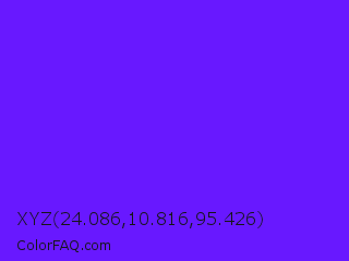 XYZ 24.086,10.816,95.426 Color is a normal violet color and the nearest color is Han Purple #5218fa. Hex code #6818ff and RGB value is rgb(104,24,255). In RGB color space, this color is composed of 41% red, 9% green, 100% blue, In CMYK color space, this color is composed of 59% cyan, 91% magenta, 0% yellow , 0% black , In HSL color space, this color has a hue angle of 261° , 100% saturation and 55% lightness.