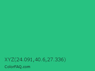 XYZ 24.091,40.6,27.336 Color is a normal green color and the nearest color is Mountain Meadow #30ba8f. Hex code #27c281 and RGB value is rgb(39,194,129). In RGB color space, this color is composed of 15% red, 76% green, 51% blue, In CMYK color space, this color is composed of 80% cyan, 0% magenta, 34% yellow , 24% black , In HSL color space, this color has a hue angle of 155° , 67% saturation and 46% lightness.