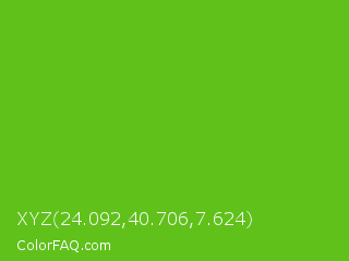 XYZ 24.092,40.706,7.624 Color is a normal green color and the nearest color is Kelly Green #4cbb17. Hex code #60c11b and RGB value is rgb(96,193,27). In RGB color space, this color is composed of 38% red, 76% green, 11% blue, In CMYK color space, this color is composed of 50% cyan, 0% magenta, 86% yellow , 24% black , In HSL color space, this color has a hue angle of 95° , 75% saturation and 43% lightness.