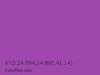 XYZ 24.094,14.895,41.14 Color is a normal magenta color and the nearest color is Purpureus #9a4eae. Hex code #9f47ad and RGB value is rgb(159,71,173). In RGB color space, this color is composed of 62% red, 28% green, 68% blue, In CMYK color space, this color is composed of 8% cyan, 59% magenta, 0% yellow , 32% black , In HSL color space, this color has a hue angle of 292° , 42% saturation and 48% lightness.