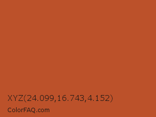 XYZ 24.099,16.743,4.152 Color is a normal orange color and the nearest color is Tuscany #bd5e2e. Hex code #bc512a and RGB value is rgb(188,81,42). In RGB color space, this color is composed of 74% red, 32% green, 16% blue, In CMYK color space, this color is composed of 0% cyan, 57% magenta, 78% yellow , 26% black , In HSL color space, this color has a hue angle of 16° , 63% saturation and 45% lightness.