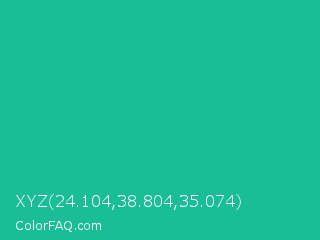 XYZ 24.104,38.804,35.074 Color is a normal cyan color and the nearest color is Mountain Meadow Crayola #1ab385. Hex code #19bd96 and RGB value is rgb(25,189,150). In RGB color space, this color is composed of 10% red, 74% green, 59% blue, In CMYK color space, this color is composed of 87% cyan, 0% magenta, 21% yellow , 26% black , In HSL color space, this color has a hue angle of 166° , 77% saturation and 42% lightness.