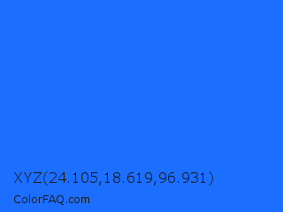 XYZ 24.105,18.619,96.931 Color is a normal blue color and the nearest color is Blue Crayola #1f75fe. Hex code #1c6eff and RGB value is rgb(28,110,255). In RGB color space, this color is composed of 11% red, 43% green, 100% blue, In CMYK color space, this color is composed of 89% cyan, 57% magenta, 0% yellow , 0% black , In HSL color space, this color has a hue angle of 218° , 100% saturation and 55% lightness.