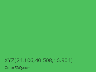 XYZ 24.106,40.508,16.904 Color is a normal green color and the nearest color is Emerald #50c878. Hex code #4dc15d and RGB value is rgb(77,193,93). In RGB color space, this color is composed of 30% red, 76% green, 36% blue, In CMYK color space, this color is composed of 60% cyan, 0% magenta, 52% yellow , 24% black , In HSL color space, this color has a hue angle of 128° , 48% saturation and 53% lightness.