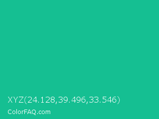 XYZ 24.128,39.496,33.546 Color is a normal cyan color and the nearest color is Mountain Meadow Crayola #1ab385. Hex code #15bf92 and RGB value is rgb(21,191,146). In RGB color space, this color is composed of 8% red, 75% green, 57% blue, In CMYK color space, this color is composed of 89% cyan, 0% magenta, 24% yellow , 25% black , In HSL color space, this color has a hue angle of 164° , 80% saturation and 42% lightness.