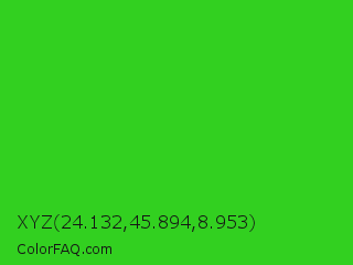 XYZ 24.132,45.894,8.953 Color is a normal green color and the nearest color is Lime Green #32cd32. Hex code #32d020 and RGB value is rgb(50,208,32). In RGB color space, this color is composed of 20% red, 82% green, 13% blue, In CMYK color space, this color is composed of 76% cyan, 0% magenta, 85% yellow , 18% black , In HSL color space, this color has a hue angle of 114° , 73% saturation and 47% lightness.