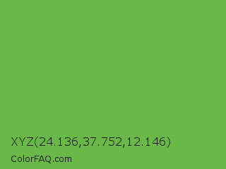 XYZ 24.136,37.752,12.146 Color is a normal green color and the nearest color is Green RYB #66b032. Hex code #69b848 and RGB value is rgb(105,184,72). In RGB color space, this color is composed of 41% red, 72% green, 28% blue, In CMYK color space, this color is composed of 43% cyan, 0% magenta, 61% yellow , 28% black , In HSL color space, this color has a hue angle of 102° , 44% saturation and 50% lightness.