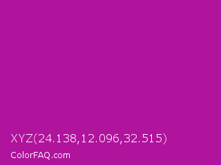 XYZ 24.138,12.096,32.515 Color is a normal magenta color and the nearest color is Violet Eggplant #991199. Hex code #b0139c and RGB value is rgb(176,19,156). In RGB color space, this color is composed of 69% red, 7% green, 61% blue, In CMYK color space, this color is composed of 0% cyan, 89% magenta, 11% yellow , 31% black , In HSL color space, this color has a hue angle of 308° , 81% saturation and 38% lightness.