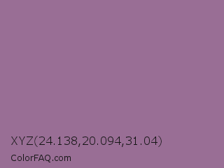 XYZ 24.138,20.094,31.04 Color is a normal magenta color and the nearest color is Mountbatten Pink #997a8d. Hex code #996e95 and RGB value is rgb(153,110,149). In RGB color space, this color is composed of 60% red, 43% green, 58% blue, In CMYK color space, this color is composed of 0% cyan, 28% magenta, 3% yellow , 40% black , In HSL color space, this color has a hue angle of 306° , 17% saturation and 52% lightness.
