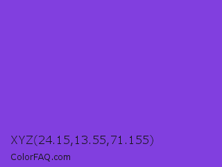 XYZ 24.15,13.55,71.155 Color is a normal violet color and the nearest color is Blue Violet #8a2be2. Hex code #813fdf and RGB value is rgb(129,63,223). In RGB color space, this color is composed of 51% red, 25% green, 87% blue, In CMYK color space, this color is composed of 42% cyan, 72% magenta, 0% yellow , 13% black , In HSL color space, this color has a hue angle of 265° , 71% saturation and 56% lightness.