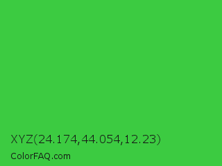 XYZ 24.174,44.054,12.23 Color is a normal green color and the nearest color is Lime Green #32cd32. Hex code #3ccb41 and RGB value is rgb(60,203,65). In RGB color space, this color is composed of 24% red, 80% green, 25% blue, In CMYK color space, this color is composed of 70% cyan, 0% magenta, 68% yellow , 20% black , In HSL color space, this color has a hue angle of 122° , 58% saturation and 52% lightness.