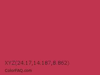 XYZ 24.17,14.187,8.862 Color is a normal red color and the nearest color is Dingy Dungeon #c53151. Hex code #bf354f and RGB value is rgb(191,53,79). In RGB color space, this color is composed of 75% red, 21% green, 31% blue, In CMYK color space, this color is composed of 0% cyan, 72% magenta, 59% yellow , 25% black , In HSL color space, this color has a hue angle of 349° , 57% saturation and 48% lightness.