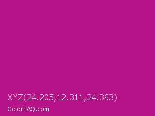 XYZ 24.205,12.311,24.393 Color is a normal magenta color and the nearest color is Red Violet #c71585. Hex code #b71388 and RGB value is rgb(183,19,136). In RGB color space, this color is composed of 72% red, 7% green, 53% blue, In CMYK color space, this color is composed of 0% cyan, 90% magenta, 26% yellow , 28% black , In HSL color space, this color has a hue angle of 317° , 81% saturation and 40% lightness.