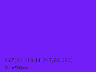 XYZ 24.218,11.217,89.696 Color is a normal violet color and the nearest color is Electric Indigo #6f00ff. Hex code #711ef8 and RGB value is rgb(113,30,248). In RGB color space, this color is composed of 44% red, 12% green, 97% blue, In CMYK color space, this color is composed of 54% cyan, 88% magenta, 0% yellow , 3% black , In HSL color space, this color has a hue angle of 263° , 94% saturation and 55% lightness.
