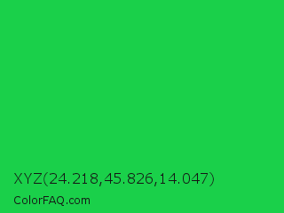 XYZ 24.218,45.826,14.047 Color is a normal green color and the nearest color is Malachite #0bda51. Hex code #1ad04a and RGB value is rgb(26,208,74). In RGB color space, this color is composed of 10% red, 82% green, 29% blue, In CMYK color space, this color is composed of 88% cyan, 0% magenta, 64% yellow , 18% black , In HSL color space, this color has a hue angle of 136° , 78% saturation and 46% lightness.