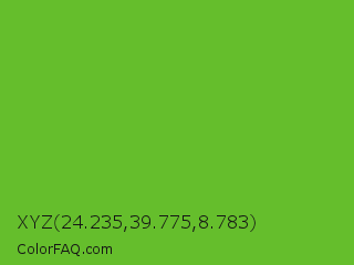 XYZ 24.235,39.775,8.783 Color is a normal green color and the nearest color is Green RYB #66b032. Hex code #65be2c and RGB value is rgb(101,190,44). In RGB color space, this color is composed of 40% red, 75% green, 17% blue, In CMYK color space, this color is composed of 47% cyan, 0% magenta, 77% yellow , 25% black , In HSL color space, this color has a hue angle of 97° , 62% saturation and 46% lightness.