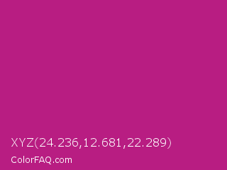 XYZ 24.236,12.681,22.289 Color is a normal magenta color and the nearest color is Red Violet #c71585. Hex code #b81d82 and RGB value is rgb(184,29,130). In RGB color space, this color is composed of 72% red, 11% green, 51% blue, In CMYK color space, this color is composed of 0% cyan, 84% magenta, 29% yellow , 28% black , In HSL color space, this color has a hue angle of 321° , 73% saturation and 42% lightness.