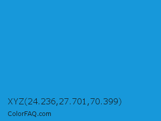 XYZ 24.236,27.701,70.399 Color is a normal blue color and the nearest color is Curious Blue #2596d1. Hex code #1798da and RGB value is rgb(23,152,218). In RGB color space, this color is composed of 9% red, 60% green, 85% blue, In CMYK color space, this color is composed of 89% cyan, 30% magenta, 0% yellow , 15% black , In HSL color space, this color has a hue angle of 200° , 81% saturation and 47% lightness.