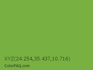 XYZ 24.254,35.437,10.716 Color is a normal green color and the nearest color is Sushi #87ab39. Hex code #78b042 and RGB value is rgb(120,176,66). In RGB color space, this color is composed of 47% red, 69% green, 26% blue, In CMYK color space, this color is composed of 32% cyan, 0% magenta, 63% yellow , 31% black , In HSL color space, this color has a hue angle of 91° , 45% saturation and 47% lightness.