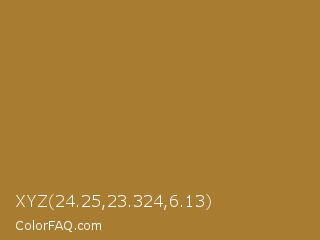 XYZ 24.25,23.324,6.13 Color is a normal orange color and the nearest color is Luxor Gold #a7882c. Hex code #a97d31 and RGB value is rgb(169,125,49). In RGB color space, this color is composed of 66% red, 49% green, 19% blue, In CMYK color space, this color is composed of 0% cyan, 26% magenta, 71% yellow , 34% black , In HSL color space, this color has a hue angle of 38° , 55% saturation and 43% lightness.
