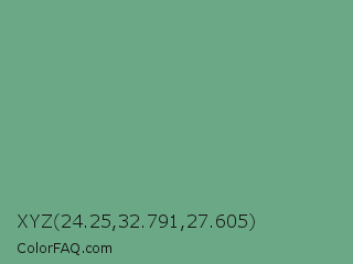 XYZ 24.25,32.791,27.605 Color is a normal green color and the nearest color is Silver Tree #66b58f. Hex code #6aa886 and RGB value is rgb(106,168,134). In RGB color space, this color is composed of 42% red, 66% green, 53% blue, In CMYK color space, this color is composed of 37% cyan, 0% magenta, 20% yellow , 34% black , In HSL color space, this color has a hue angle of 147° , 26% saturation and 54% lightness.