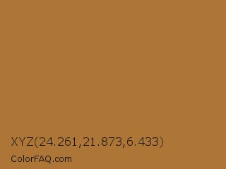 XYZ 24.261,21.873,6.433 Color is a normal orange color and the nearest color is Copper #b87333. Hex code #ad7536 and RGB value is rgb(173,117,54). In RGB color space, this color is composed of 68% red, 46% green, 21% blue, In CMYK color space, this color is composed of 0% cyan, 32% magenta, 69% yellow , 32% black , In HSL color space, this color has a hue angle of 32° , 52% saturation and 45% lightness.
