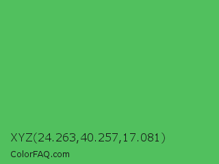 XYZ 24.263,40.257,17.081 Color is a normal green color and the nearest color is Fern #63b76c. Hex code #51c05e and RGB value is rgb(81,192,94). In RGB color space, this color is composed of 32% red, 75% green, 37% blue, In CMYK color space, this color is composed of 58% cyan, 0% magenta, 51% yellow , 25% black , In HSL color space, this color has a hue angle of 127° , 47% saturation and 54% lightness.