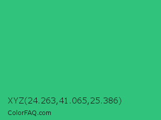 XYZ 24.263,41.065,25.386 Color is a normal green color and the nearest color is UFO Green #3cd070. Hex code #2fc37b and RGB value is rgb(47,195,123). In RGB color space, this color is composed of 18% red, 76% green, 48% blue, In CMYK color space, this color is composed of 76% cyan, 0% magenta, 37% yellow , 24% black , In HSL color space, this color has a hue angle of 151° , 61% saturation and 47% lightness.