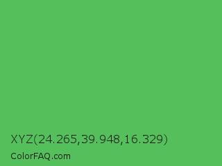 XYZ 24.265,39.948,16.329 Color is a normal green color and the nearest color is Fern #63b76c. Hex code #55bf5b and RGB value is rgb(85,191,91). In RGB color space, this color is composed of 33% red, 75% green, 36% blue, In CMYK color space, this color is composed of 55% cyan, 0% magenta, 52% yellow , 25% black , In HSL color space, this color has a hue angle of 123° , 45% saturation and 54% lightness.
