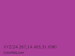 XYZ 24.267,14.403,31.638 Color is a normal magenta color and the nearest color is Fandango #b53389. Hex code #ab3e99 and RGB value is rgb(171,62,153). In RGB color space, this color is composed of 67% red, 24% green, 60% blue, In CMYK color space, this color is composed of 0% cyan, 64% magenta, 11% yellow , 33% black , In HSL color space, this color has a hue angle of 310° , 47% saturation and 46% lightness.
