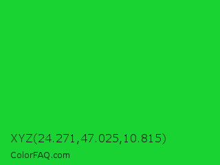 XYZ 24.271,47.025,10.815 Color is a normal green color and the nearest color is Lime Green #32cd32. Hex code #19d332 and RGB value is rgb(25,211,50). In RGB color space, this color is composed of 10% red, 83% green, 20% blue, In CMYK color space, this color is composed of 88% cyan, 0% magenta, 76% yellow , 17% black , In HSL color space, this color has a hue angle of 128° , 79% saturation and 46% lightness.