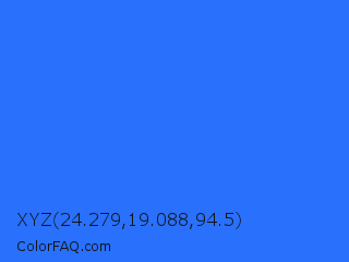 XYZ 24.279,19.088,94.5 Color is a normal blue color and the nearest color is Blue Crayola #1f75fe. Hex code #2970fc and RGB value is rgb(41,112,252). In RGB color space, this color is composed of 16% red, 44% green, 99% blue, In CMYK color space, this color is composed of 84% cyan, 56% magenta, 0% yellow , 1% black , In HSL color space, this color has a hue angle of 220° , 97% saturation and 57% lightness.