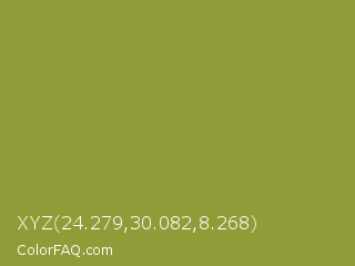 XYZ 24.279,30.082,8.268 Color is a normal yellow color and the nearest color is Sycamore #908d39. Hex code #919c38 and RGB value is rgb(145,156,56). In RGB color space, this color is composed of 57% red, 61% green, 22% blue, In CMYK color space, this color is composed of 7% cyan, 0% magenta, 64% yellow , 39% black , In HSL color space, this color has a hue angle of 67° , 47% saturation and 42% lightness.