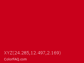 XYZ 24.285,12.497,2.169 Color is a normal red color and the nearest color is Monza #c7031e. Hex code #c9001b and RGB value is rgb(201,0,27). In RGB color space, this color is composed of 79% red, 0% green, 11% blue, In CMYK color space, this color is composed of 0% cyan, 100% magenta, 87% yellow , 21% black , In HSL color space, this color has a hue angle of 352° , 100% saturation and 39% lightness.