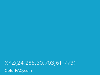 XYZ 24.285,30.703,61.773 Color is a normal cyan color and the nearest color is Pacific Blue #1ca9c9. Hex code #14a3cc and RGB value is rgb(20,163,204). In RGB color space, this color is composed of 8% red, 64% green, 80% blue, In CMYK color space, this color is composed of 90% cyan, 20% magenta, 0% yellow , 20% black , In HSL color space, this color has a hue angle of 193° , 82% saturation and 44% lightness.