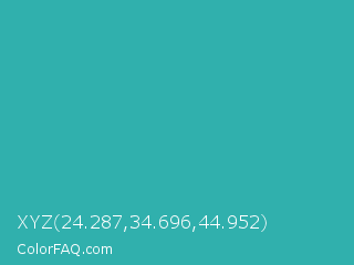 XYZ 24.287,34.696,44.952 Color is a normal cyan color and the nearest color is Light Sea Green #20b2aa. Hex code #30b0ad and RGB value is rgb(48,176,173). In RGB color space, this color is composed of 19% red, 69% green, 68% blue, In CMYK color space, this color is composed of 73% cyan, 0% magenta, 2% yellow , 31% black , In HSL color space, this color has a hue angle of 179° , 57% saturation and 44% lightness.