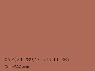 XYZ 24.289,19.979,11.38 Color is a normal red color and the nearest color is Santa Fe #b16d52. Hex code #ae6a56 and RGB value is rgb(174,106,86). In RGB color space, this color is composed of 68% red, 42% green, 34% blue, In CMYK color space, this color is composed of 0% cyan, 39% magenta, 51% yellow , 32% black , In HSL color space, this color has a hue angle of 14° , 35% saturation and 51% lightness.