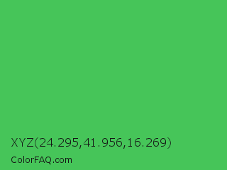 XYZ 24.295,41.956,16.269 Color is a normal green color and the nearest color is UFO Green #3cd070. Hex code #46c559 and RGB value is rgb(70,197,89). In RGB color space, this color is composed of 27% red, 77% green, 35% blue, In CMYK color space, this color is composed of 64% cyan, 0% magenta, 55% yellow , 23% black , In HSL color space, this color has a hue angle of 129° , 52% saturation and 52% lightness.
