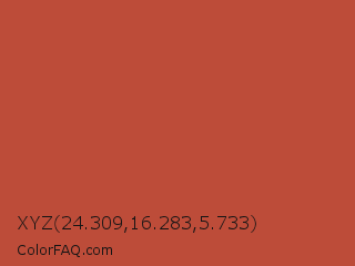 XYZ 24.309,16.283,5.733 Color is a normal red color and the nearest color is Mojo #c04737. Hex code #bd4c39 and RGB value is rgb(189,76,57). In RGB color space, this color is composed of 74% red, 30% green, 22% blue, In CMYK color space, this color is composed of 0% cyan, 60% magenta, 70% yellow , 26% black , In HSL color space, this color has a hue angle of 9° , 54% saturation and 48% lightness.
