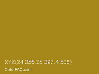 XYZ 24.356,25.397,4.538 Color is a normal yellow color and the nearest color is Reef Gold #9f821c. Hex code #a58719 and RGB value is rgb(165,135,25). In RGB color space, this color is composed of 65% red, 53% green, 10% blue, In CMYK color space, this color is composed of 0% cyan, 18% magenta, 85% yellow , 35% black , In HSL color space, this color has a hue angle of 47° , 74% saturation and 37% lightness.