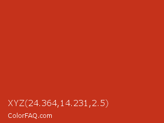 XYZ 24.364,14.231,2.5 Color is a normal red color and the nearest color is Thunderbird #c02b18. Hex code #c5321b and RGB value is rgb(197,50,27). In RGB color space, this color is composed of 77% red, 20% green, 11% blue, In CMYK color space, this color is composed of 0% cyan, 75% magenta, 86% yellow , 23% black , In HSL color space, this color has a hue angle of 8° , 76% saturation and 44% lightness.