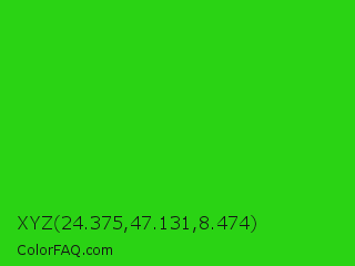 XYZ 24.375,47.131,8.474 Color is a normal green color and the nearest color is Harlequin Green #46cb18. Hex code #2ad314 and RGB value is rgb(42,211,20). In RGB color space, this color is composed of 16% red, 83% green, 8% blue, In CMYK color space, this color is composed of 80% cyan, 0% magenta, 91% yellow , 17% black , In HSL color space, this color has a hue angle of 113° , 83% saturation and 45% lightness.