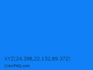 XYZ 24.398,22.132,89.372 Color is a normal blue color and the nearest color is Azure Radiance #007fff. Hex code #0f80f5 and RGB value is rgb(15,128,245). In RGB color space, this color is composed of 6% red, 50% green, 96% blue, In CMYK color space, this color is composed of 94% cyan, 48% magenta, 0% yellow , 4% black , In HSL color space, this color has a hue angle of 211° , 92% saturation and 51% lightness.
