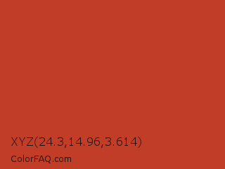 XYZ 24.3,14.96,3.614 Color is a normal red color and the nearest color is Dark Pastel Red #c23b22. Hex code #c23d28 and RGB value is rgb(194,61,40). In RGB color space, this color is composed of 76% red, 24% green, 16% blue, In CMYK color space, this color is composed of 0% cyan, 69% magenta, 79% yellow , 24% black , In HSL color space, this color has a hue angle of 8° , 66% saturation and 46% lightness.