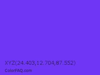 XYZ 24.403,12.704,87.552 Color is a normal indigo color and the nearest color is Blue Violet #8a2be2. Hex code #6f37f5 and RGB value is rgb(111,55,245). In RGB color space, this color is composed of 44% red, 22% green, 96% blue, In CMYK color space, this color is composed of 55% cyan, 78% magenta, 0% yellow , 4% black , In HSL color space, this color has a hue angle of 258° , 90% saturation and 59% lightness.