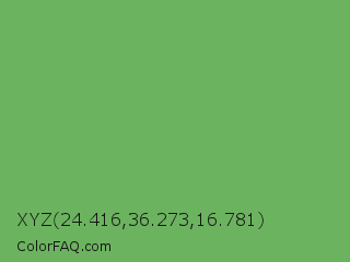 XYZ 24.416,36.273,16.781 Color is a normal green color and the nearest color is Bud Green #7bb661. Hex code #6cb360 and RGB value is rgb(108,179,96). In RGB color space, this color is composed of 42% red, 70% green, 38% blue, In CMYK color space, this color is composed of 40% cyan, 0% magenta, 46% yellow , 30% black , In HSL color space, this color has a hue angle of 111° , 35% saturation and 54% lightness.